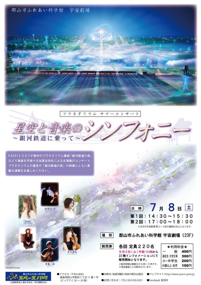 郡山市ふれあい科学館プラネタリウムで「星空と音楽のシンフォニー郡山市ふれあい科学館プラネタリウムで「星空と音楽のシンフォニー ~銀河鉄道に乗って~」が開催されました。14:30〜と17:00〜の二回公演を行い、両方とも満席となり大変嬉しかったです。